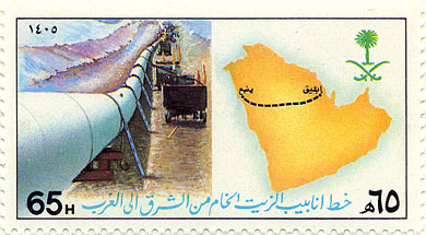 طابع بريد سعودي يعود لعام 1985 ميلاديه ، يظهر خط الانابيب الذي يرحل الزيت الخام من حقول البترول الكائنة في مدينة بقيق ( مدينة أنشأت بعد اكتشاف النفط ، يشتغل معظم قاطنوها في صناعة النفط ويبلغ عدد سكانها حوالي 70 ألف نسمة.تتوسط المسافه بين مدينتي الدمام و الهفوف تبعد عن كل واحده حوالي 80 كيلومتر ، بها أكبر محطة لتكرير البترول في العالم تبعد عن الخليج العربي حوالي 60 كيلومتر تشهد المدينة نهضة تعليمية وعمرانية وتتميز بالهدوء والنظافة ) بالمنطقة الشرقيه ويوصلها الى مربط الصهاريج في مدينة ينبع ( أصل تسمية المدينة يعود كما -بذكر المؤرخون- لأنها تحتوي على 370 عين ماء جاريا ) قرب البحر الأحمر وقد ظهرت طوابع كثيره تصور او ترسم عمليات نقل البترول عبر الانابيب الى الصهاريج عالميا مثل طوابع بريديه خاصه بجمهورية الصين وقطر و ليبيا و الاتحاد االسوفيتي .
