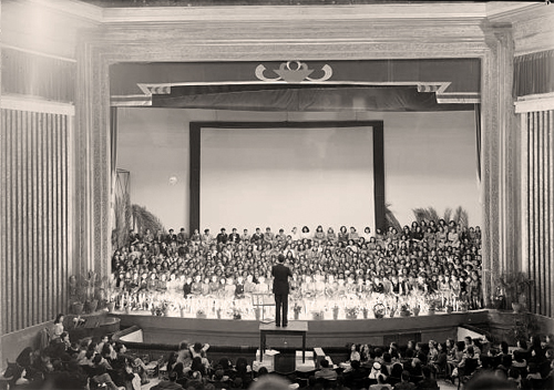 هذه الصورة تعود لعام 1944 ميلاديه ، التصوير بها داخلي و يظهر القاعة الداخلية الملحقة بدار العرض  ، الجماهير اتت للاستماع و المشاهده من بلاد مختلفه ومدن عديده ، المايسترو يقود الفرقه ، عازفة البيانو جلست بهدوء في جانب الصوره ، بينما الكورال و الفرقة الموسيقيه توزعوا على المسرح واخذوا اماكنهم كل وفق ما هو مطلوب منه .