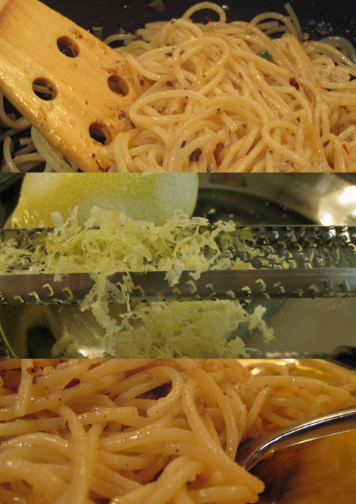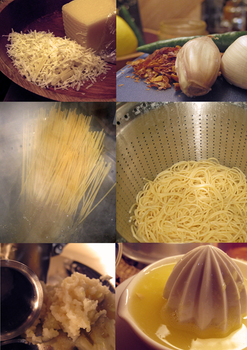 ( مكرونه سباجيتي ، قطعة من الجبنه البارميزان مبشوره في التو اي ليست معلبه او محفوظه ، فلفل اخضر حار ، ثوم مهروس ، عصير ليمون مع بشر قشر الليمونه ، فلفل احمر حار مجفف ومطحون للتو ، زيت زيتون ، زبده ، ملح ، فلفل اسود ) .