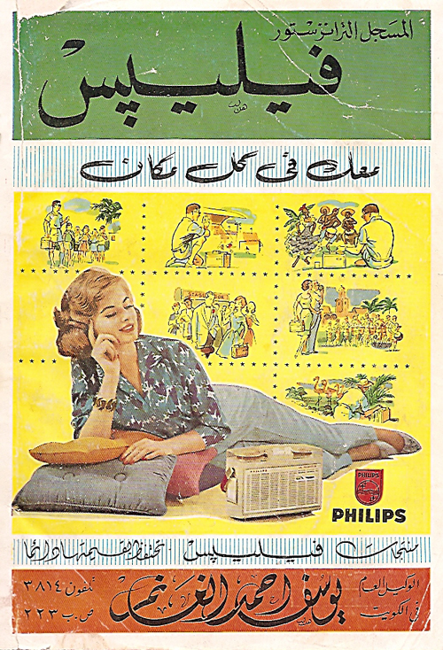 بوستر اعلاني تم نشره في دولة ” الكويت ” و يعود لعام 1963 ميلاديه ، يلحن على نفس الفكرة التي تسخدم اليوم في ترويج اجهزة الأم بي ثري و الأي بود المتنقلة وهي امكانية حمل اغانيك المفضله معك في كل مكان .