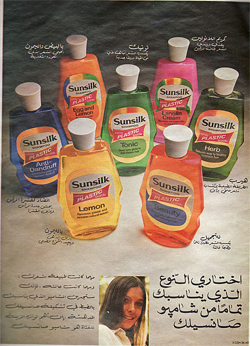 يعود لعام 1974 ميلاديه ، نشر بمجلة الاسبوع العربي اللبنانيه في العدد 793 ، كان شكل الزجاجات مختلف عما كان متعارف عليه في مرحلة الثمانينات او حتى اليوم ، لكن تعددية الالوان والانواع كانت كما هي ، من ضمن ما يلاحظ الملصق الذي كتب فوق الزجاجه عبارة ( عبوة بلاستيكيه جديده ) وهذا قد يشير الى تغيير ما في شكل العبوة او اختلاف في المعدن المستخدم سابقا والذي قد يكون زجاج مثلا او قد لا يكون .