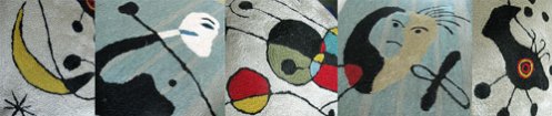 كانت معي والدتي حين شاهدتها و لمست اعجابي بها في هذا المعرض فاشترت لي بعضا مما اعجبني ، من ضمن الاسماء الشهيرة التي استخدمت لوحاتها لنسج هذه الاعمال ، بابلو بيكاسو وللاسف لم ابتع من تشكيلته شيئا كون اغلبها تم بيعه ولم يتبقى سوى واحده لم تنل اعجابي ، اما خوان ميرو فقد اشتريت اثنتين مما هو معروض له وهو كثير ، احببت ايضا قطع مميزة لـ غوستاف كيلمت ، بالاضافة الى  قطع اخرى تشبه زخارف فترة الستينات و ربما اوئل السبعينات لكن لم اعرف هي لمن من الفنانين ولاي فترة زمنية بدقة تنتمي   .