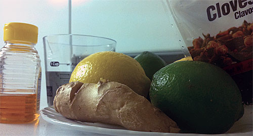 المكونات كانت بسيطه ليمون اصفر ، زنجبيل طازج ، عسل بالقرنفل او عسل عادي وبعض حبات من القرنفل ، كمية من الماء النقي ، وختاما ليمون اخضر ” لايم ” ويسمى –  ان لم اكن مخطئ – في مصر لمون ” بنزهير ” والكلمة الاخيره اصلها فارسي وتعنى المضاد للسموم .