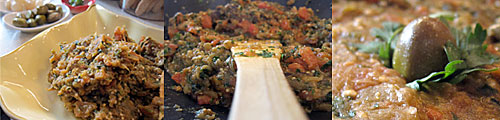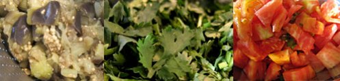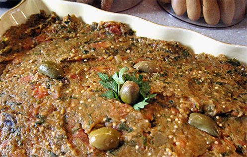 نضع مقلاة كبيره على النار بدرجة حرارة مرتفعه ، ثم نضيف زيت الزيتون ونضيف الطماطم والباذنجان و باقي المكونات كافه ، حين نسمع صوت الطهي نخفف النار الى متوسطه ونقلب المقادير بملعقة خشبيه طوال 25 دقيقه لتتمازج وتصبح قريبة من قوام متبل الباذنجان او البابا غنوج .