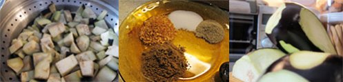 نضع اناء على النار به ملح وماء ، حين يغلي نسلق الباذنجان على نار متوسطه لمدة نصف ساعه .