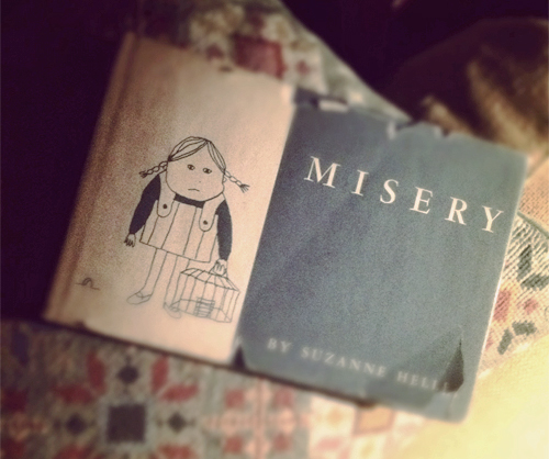 عنوان الكتاب قد يعني بالعربية بؤس او شقاء او تعاسه و ربما بقواميس اخرى معاناة و عوز و الم او عذاب وشده ، لا اجد ترجمة دقيقه لكن الكتاب برسوماته وعباراته القصيره كان يعبر عن كل او بعض ذلك .