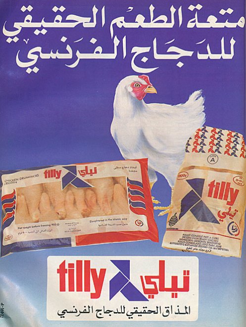 بوستر اعلاني لماركة الدجاج الفرنسية تيلي نشر عام ١٩٨٨ ميلاديه بمجلة سيدتي ، اضفت هنا سابقا الاعلان المصور له تحت عنوان فراخ تيلي و الذي كان يأتي كفاصل بين المشاهد في افلام الفيديو و كنت احبه كثيرا و احب لحنه .