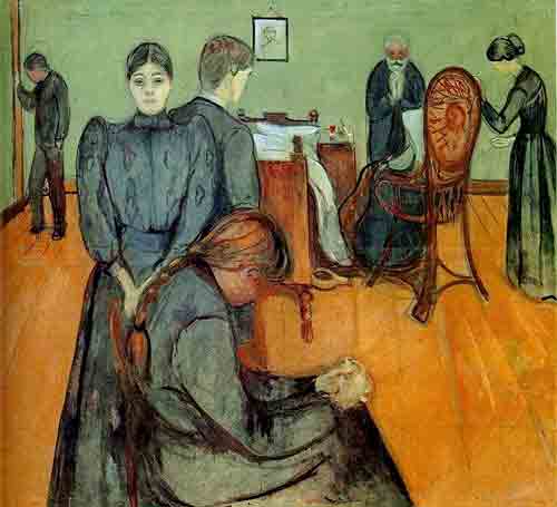 اسم اللوحة المصاحبه : الموت في غرفة المرضى للفنان ادفار مونش ، رسمت عام ١٨٩٥ ميلاديه وهي من مقتنيات المتحف الوطني بمدينة اوسلو في النرويج .