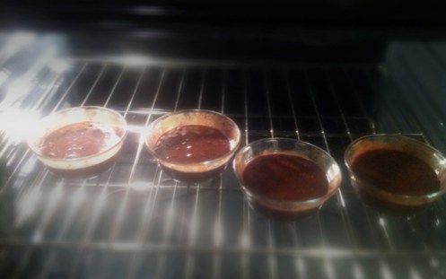 مدة الطهي الفعليه ( بالفرن ) ١٤ دقيقه فحسب كي لا يتجمد المنتصف وتصبح كيك ، درجة الحرارة تكون ٣٩٢ فهرنهايت / ٢٠٠ ديقري ، وبالهناء والعافية .