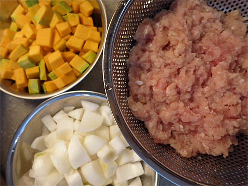 كوبان و نصف لكل من المكونات التالية : ( دجاج مفروم ، قرغ مقطع مكعبات ، بصل ابيض مقطع صغير ) .
