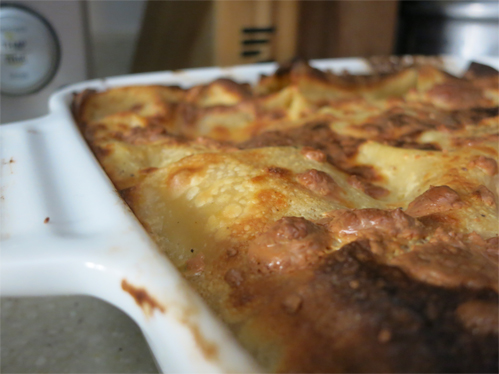 نعود لنسكب فوق ما سبق بعض الصوص الابيض مرة اخرى و طبقة جديدة من اللزانيا و نستمر في تكرار العملية الى أن تمتلئ الصينيه .