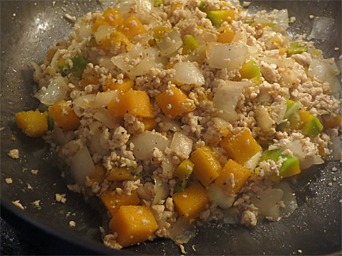 الوصفة الأصليه بلحم ديك رومي مفروم ” تركي ” و لم اجده ، لذا استخدم الدجاج المفروم عوضا عن اللحم كي يظهر طعم الخضروات الحلو في الوصفة .