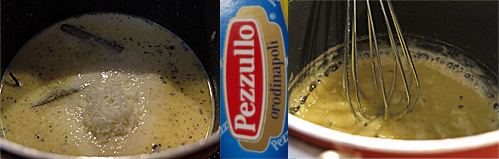 نضيف بعد ذلك الحليب بشكل متدرج ، بعد اول جزء قمنا بسكبه نضع أعواد القرنفل و بعض الملح ثم نسكب المزيد الى أن ينتهي الحليب ، نضيف ورق الغار و بعض الفلفل الأبيض و بعض الملح ثم نرقبه الى أن يغلي أو يقترب من ذلك مع التحريك الدائم .