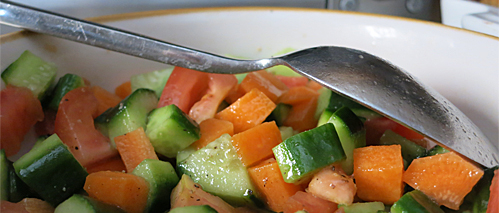 سلطة الثلاث ألوان : حبة من الجزر و اخرى من الطماطم ، بالاضافة الى حبتين من الخيار و بالامكان للنكهة اضافة بعض اوراق الكزبرة او البقدونس او الشبت الى تتبيلة الليمون و زيت الزيتون و الملح و من الممكن جدا بدونهما مثل اليوم حتى لا يخففون بطعمهم القوي نكهة اللزانيا البسيطه .