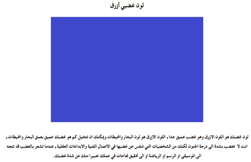 ” لون غضبك هو اللون الازرق وهو غضب عميق جدا , اللون الازرق هو لون البحار والمحيطات ويمكنك ان تتخيل كم هو غضبك عميق بعمق البحار والمحيطات , انت لا تغضب بشدة الى درجة الجنون لكنك من الشخصيات التي تنفس عن غضبها في الاعمال الفنية والابداعات العقلية , عندما تشعر بالغضب قد تتجه الى الموسيقى او الرسم او الرياضة او الى تحقيق نجاحات في عملك تعبيرا منك عن شدة غضبك.”