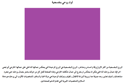 اضافه ( اختبار لون روحك ) ، كانت روحي بنفسجيه ” الروح البنفسجية من اكثر الارواح رقة واحساس ومشاعر , الروح البنفسجية هي الروح الوحيدة التي ينعكس جمالها الداخلي على جمالها الخارجي أي بمعنى اخر فإن جمال روحك الداخلي يمكن ان ينعكس او يخرج الى جمال شكلك الخارجي وهذه الصفحة تجعل كل من حولك يشعر بجمال روحك حتى بمجرد مشاهدتك , لديك تعابير وجه جميلة جدا وبريئة كبراءة الاطفال , لطيف ودولتك الوحيدة هي دولة المحبة والسلام , الشخصيات الاقرب الى روحك هم دعاة السلام والشخصيات الخيرية التي تقدم الدعم للمحتاجين ” .