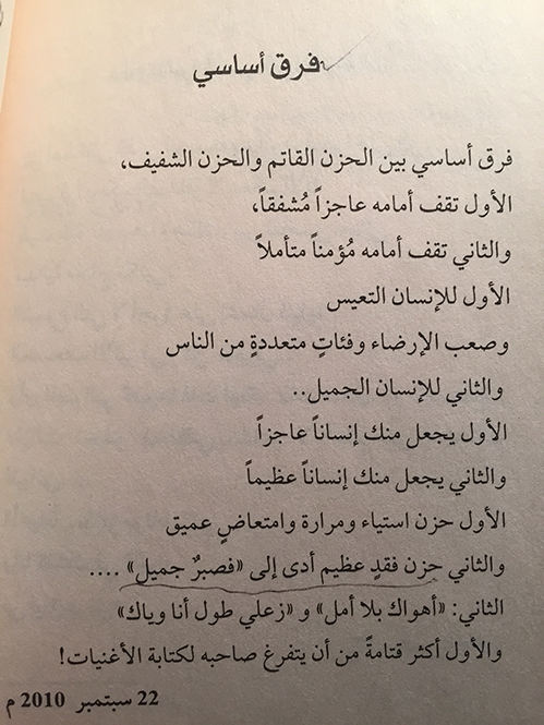 ( أيها الحزن الجميل : حررني من صخب الاشتهاء و التمني و أصبني بالحكمة دون رأفة ، و اجعلني من الطمأنينة بحيث أشيع موتاي بالبياض إلى البياض .. دون دموع ) .