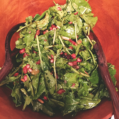 على المائدة نضع الصحن الذي به اوراق الجرجير ، ثم نضيف الطماطم و المكسرات و الخليط و الرمان و نحركهم معا و بالهناء و العافيه .