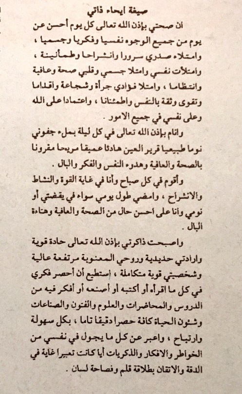 صيغة إيحاء ذاتي كتبها د. محمد فتحي لأبي رحمه الله و الذي بدوره كان يطبعها لنا كعلاج عند اي ضيق نفسي او تعب أضيفها اليوم صدقة جارية لكلاهما حفظنا الله و اياكم من كل سوء