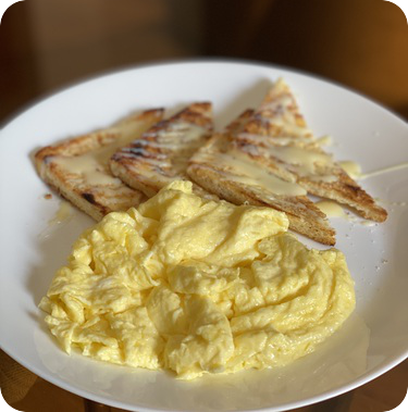 نسكبه في الصحن قرب قطع الخبز، نرش الشرائح المثلثة بالملح جيدا و كمية جيده كوننا لم نملح البيض و نزين سطح الخبز بخيوط من الحليب المكثف حيث ناخذ ملعقة ناعمه صغيرة و نسكب و نحن نحرك يدنا، في البدء قد يتردد البعض لكن حين نتذكر طعم شوكلاته الكراميل الممملحة او المربى الحلوة الطعم مع الزبدة و التوست سنتقبل الفكرة.