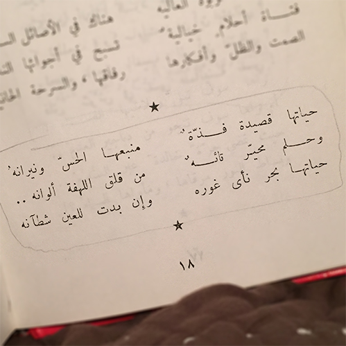 كنت أبلغ من العمر ١٤ عاما ، جذبني سماكة الكتاب الشبيه بالكتب الأجنبيه التي كنت ارى في السفر ، كان بجواره كتب لشعراء آخرين لكن العبارات هنا و بعض الجمل كانت أوضح لي من سواها كما أن بعض المشاعر المكتوبه و التشبيهات استوقفتني ، هي المرة الأولى التي اقرأ بها هذا الاسم ” فدوى طوقان ” .